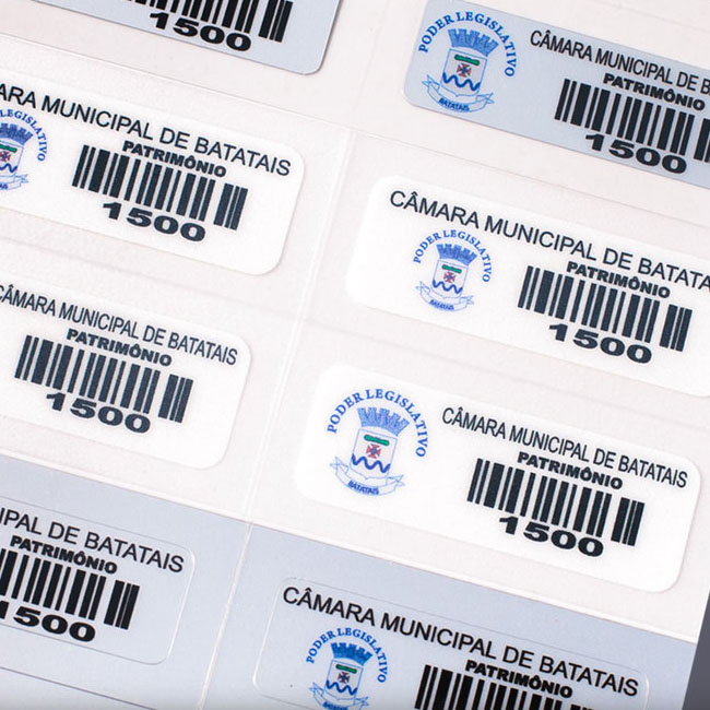 e físicos de uma empresa. Geralmente são impressos com a marca da empresa e um código de barras ou código QR. Os adesivos podem ser produzidos